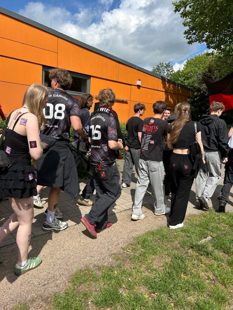 Das Derby 2025 begann dieses Jahr mit einem kriegerischem Aufmarsch an der Schule. Städter trugen wie gewünscht schwarz rot, Sticker klebten an ihren Rücken, Farbe schmierte in der prallen Sonne.