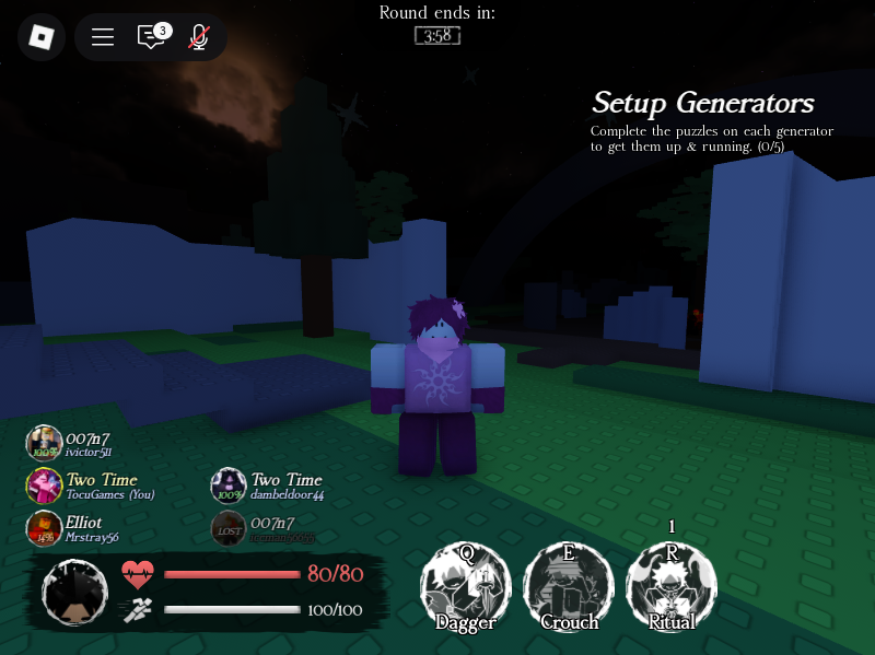 Wenn du ins Spiel reingehst, kommst du in einen Server mit maximal 8 anderen Spielern. Wenn eine Runde beginnt, wird derjenige in deinem Server, der am meisten Malice hat, zum Killer. Um Malice zu bekommen, musst du die Puzzle in den Generatoren lösen oder als letzter überleben. Wie in jedem Spiel gibt es natürlich auch Geld. Wenn du das erste Mal spielst, bekommst du 300$ als Startergeld. Es gibt auch noch verschiedene Killer und Survivor: Die 6 Killer, die momentan im Spiel sind, heißen Slasher(Jason), c00lkidd, John Doe, 1x1x1x1, Guest666 und Noli. Was sie können, werde ich später erzählen (genauso wie die Survivor). Die 11 Survivor, die momentan im Spiel sind, heißen: Noob, Elliot, Shedletsky, Builderman, Two time, 007n7, Guest1337, Taph, Veronica, Dusekkar und Chance.
