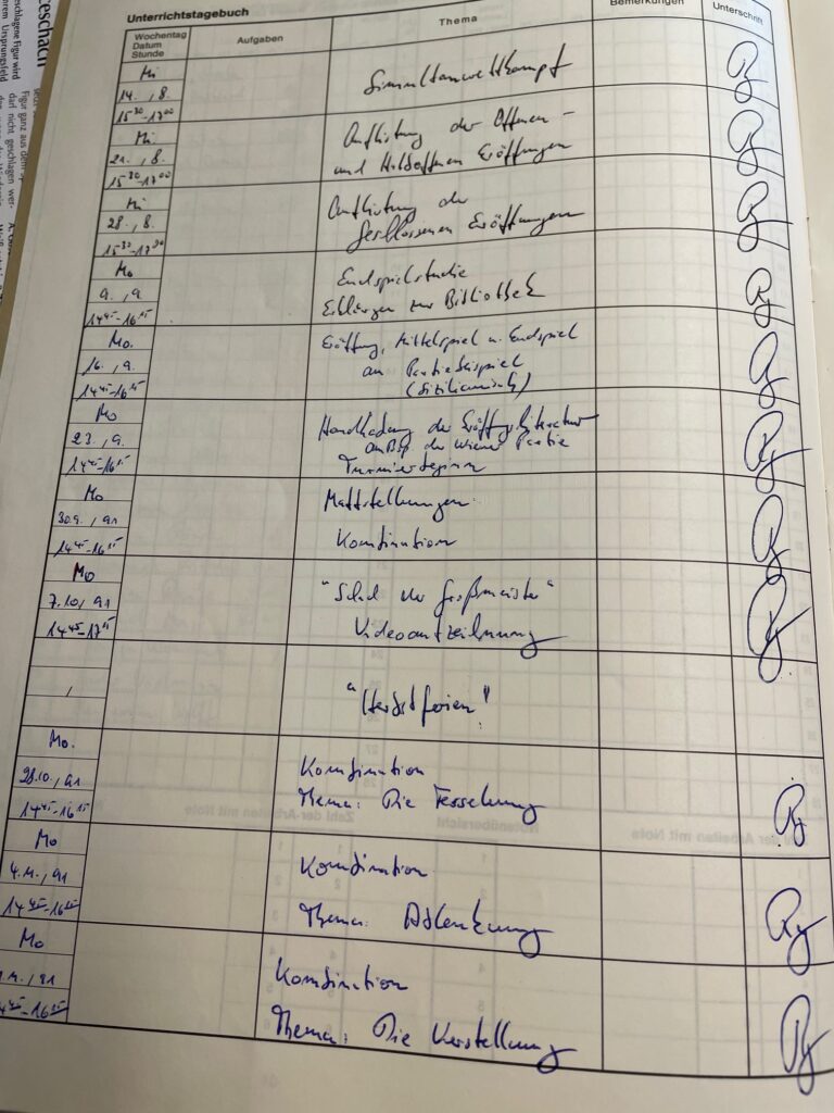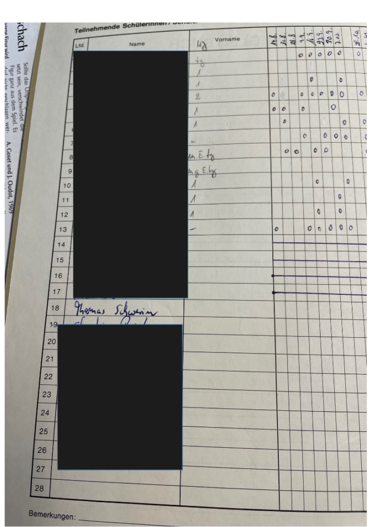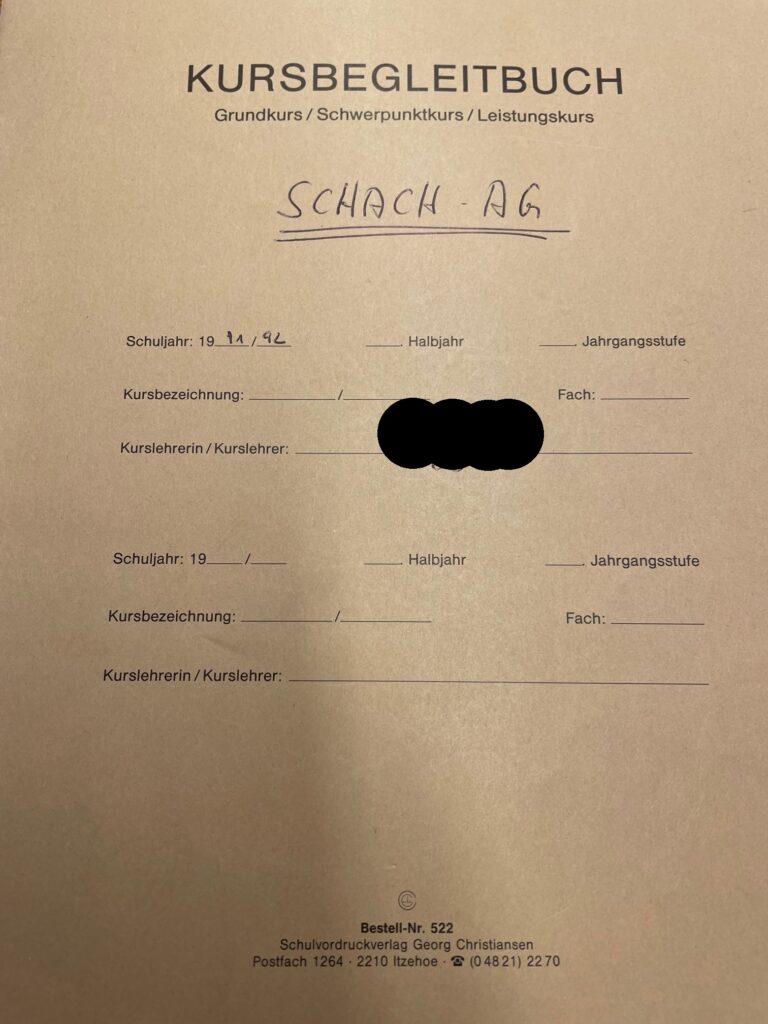Doch nicht nur heute gibt es eine Schach AG, sondern auch schon damals zur Zeit, als Herr Schwerin noch selber zur Schule ging. Aus dieser Zeit gibt es sogar noch einzelne alte Kursbücher. Hier ein Ausschnitt, in dem zu sehen ist, dass Herr Schwerin selber in die Schach AG gegangen ist: